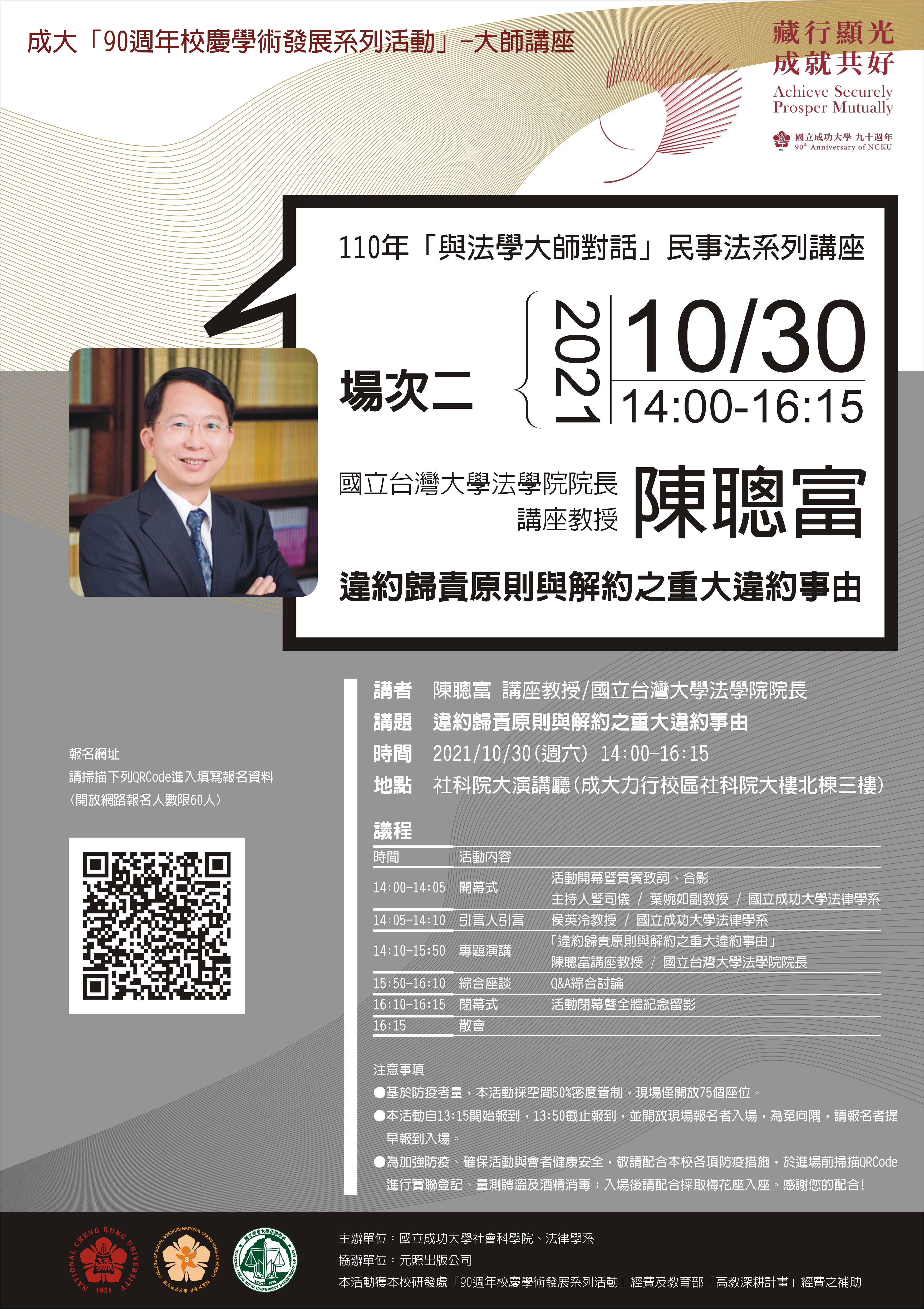 社科院及法律系配合90年校慶學術發展系列活動,特舉辦「與法學大師對話」民事法系列講座,預定邀請國立台灣大學法律學系陳自強特聘教授、台大法學院院長陳聰富講座教授及科技部法律學門召集人陳忠五特聘教授等擔任講座,以促進本校本系與其他頂尖大學法律院系所之學術交流,推升本系師生之研究學習風氣,並拓展法學知識視野,展現本校引領南部法學教育之深化學術研究教學成果。