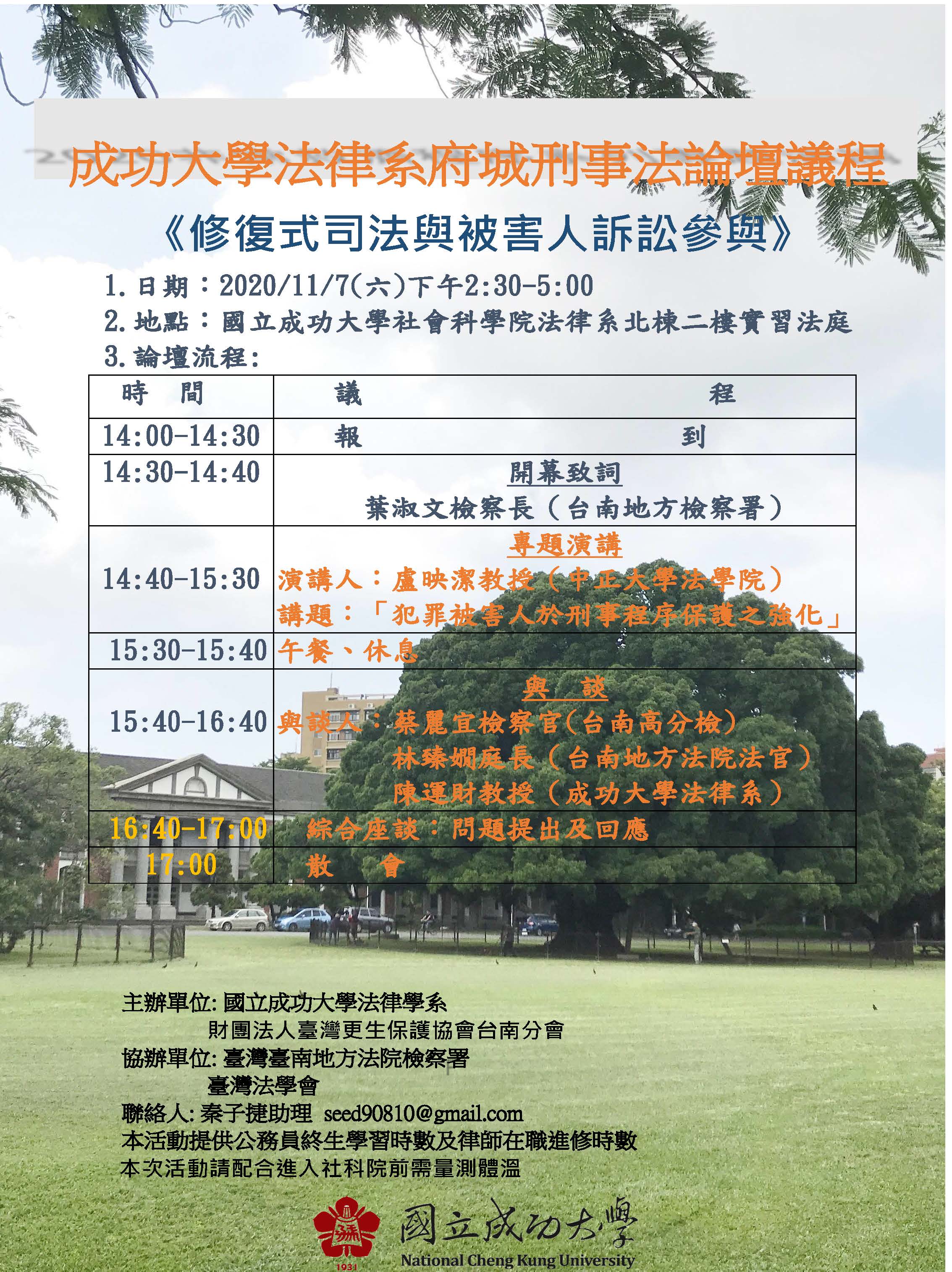 成功大學法律系府城刑事法論壇議程 《修復式司法與被害人訴訟參與》