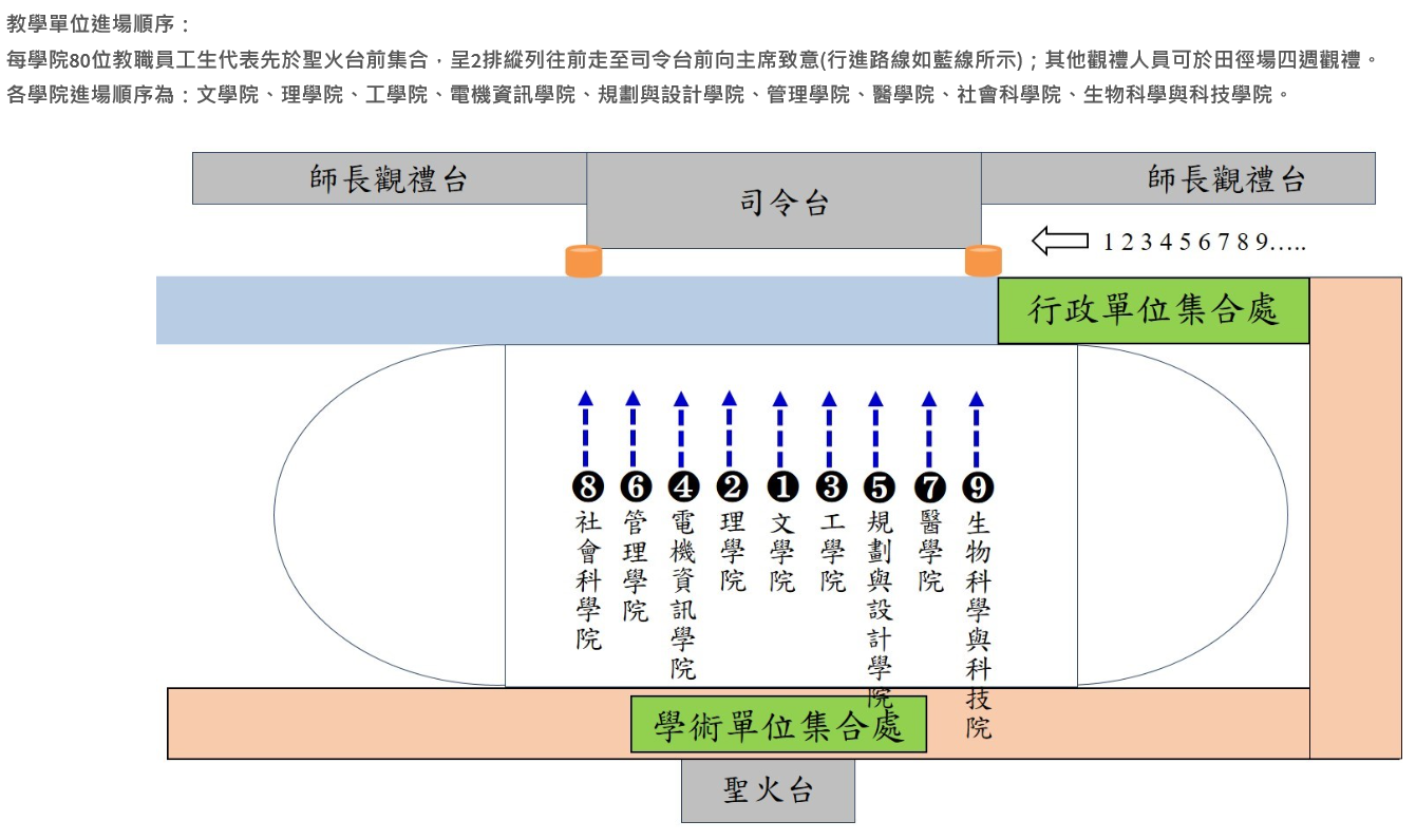 為配合本校89週年校慶暨運動大會之【開幕繞場典禮】,請各位同學注意以下事項: 一、 集合時間:109年 11月 11日(三)上午 8:30 二、 集合地點:如下圖,請到光復校區操場「聖火台」前,以院為單位集合及進場, 請注意「社會科學院」及「法律系」的單位牌。 三、 參加人員:歡迎本系全體師生踴躍參加。 (一) 由系主任領隊,其他教師自由參加。 (二) 本系依往例,由大學部一年級同學代表參加繞場,參加繞場「全程」的同學, 可計入本學期「服務學習(一)」的服務1次,請大一同學準時到場集合並簽到,如無法參加,請於109年11月9日(一)以前,至本系辦公室登記,以計算人數。 (三) 請系學會召集繞場同學及準備系旗,當場至聖火台領取法律系單位牌。 四、 繞場服裝:上身以本系之系服為主,無系服的同學及老師請穿著「黑色」上衣, 下半身請選擇適合的穿著。 五、 「法律系」排在第8順位的「社會科學院」後面,集合地點如下: