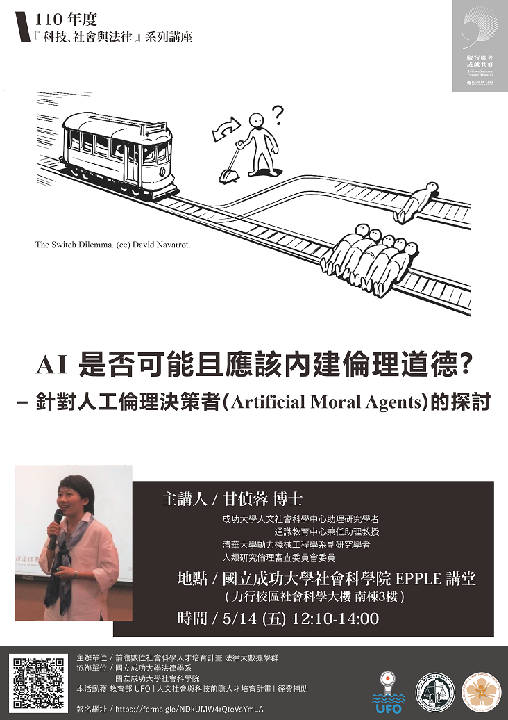 法律學系及社科院UFO計畫法律大數據學群預定於2021/5/14(週五)舉辦 110年「科技、社會與法律」系列講座第三場次,邀請清華大學動力機械工程學系研究學者 甘偵蓉 博士針對「AI是否可能且應該內建倫理道德?-針對人工倫理決策者(Artificial Moral Agents)的探討」進行開講,希望與師生共同針對AI人工智慧系統之倫理道德規範與道德決策行動者內建之道德標準等議題進行探討與交流。