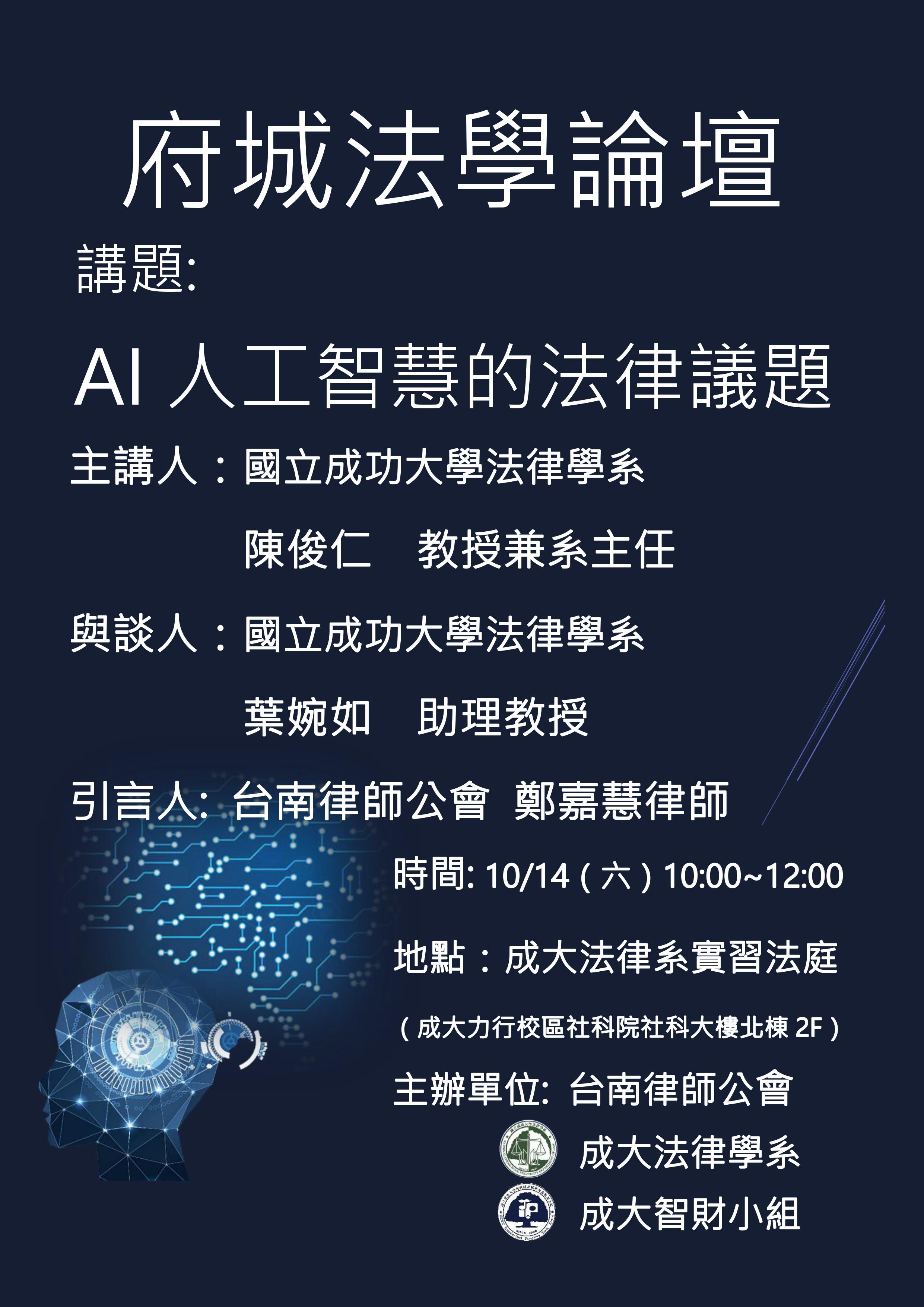 [106.10.13] 10月27日 府城法學論壇《智慧產權法世紀新挑戰:AI 人工智慧的法律分析 》智財講座