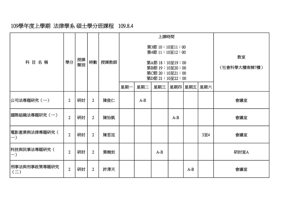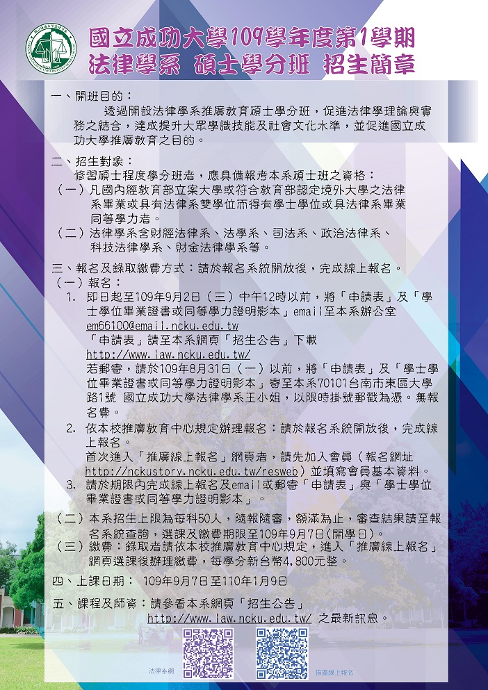 五、課程及師資:請參看本系網頁「招生公告」http://www.law.ncku.edu.tw/ 之最新訊息。