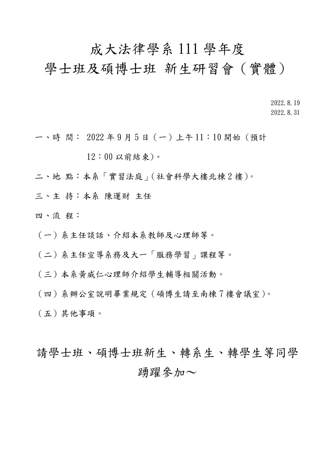 歡迎參加本系111學年度學士班及碩博士班 新生研習會 (111.9.5)