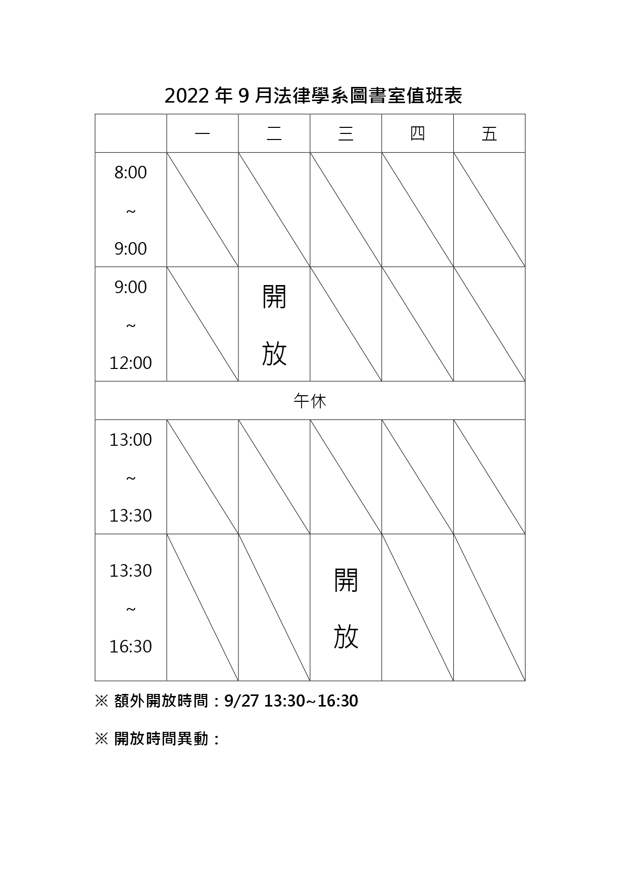 2022年9月法律學系圖書室值班表