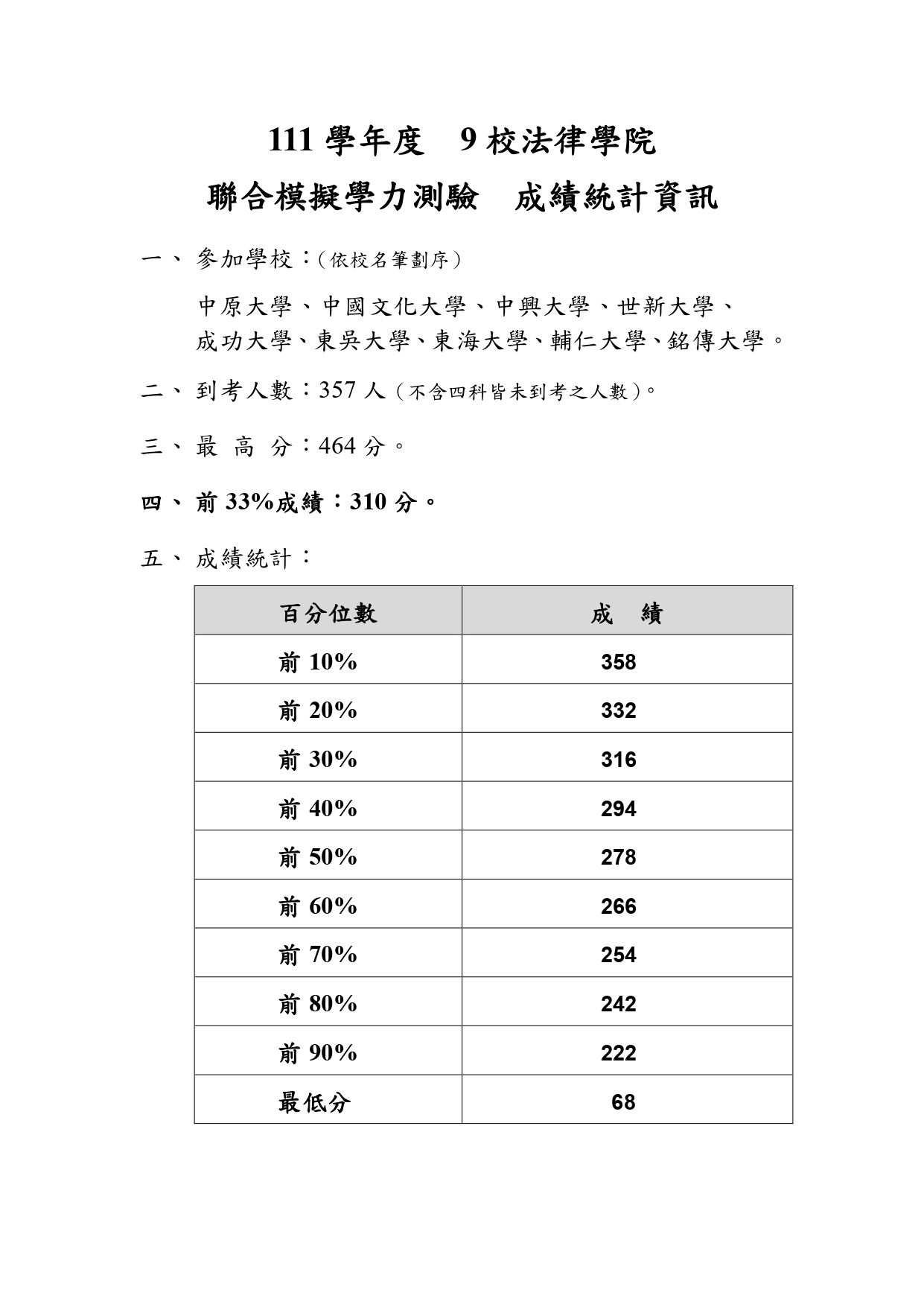 111學年度9校法律學院聯合模擬學力測驗,各考生成績已個別E-mail通知,如需紙本請至系辦領取,測驗成績級距公告如下: