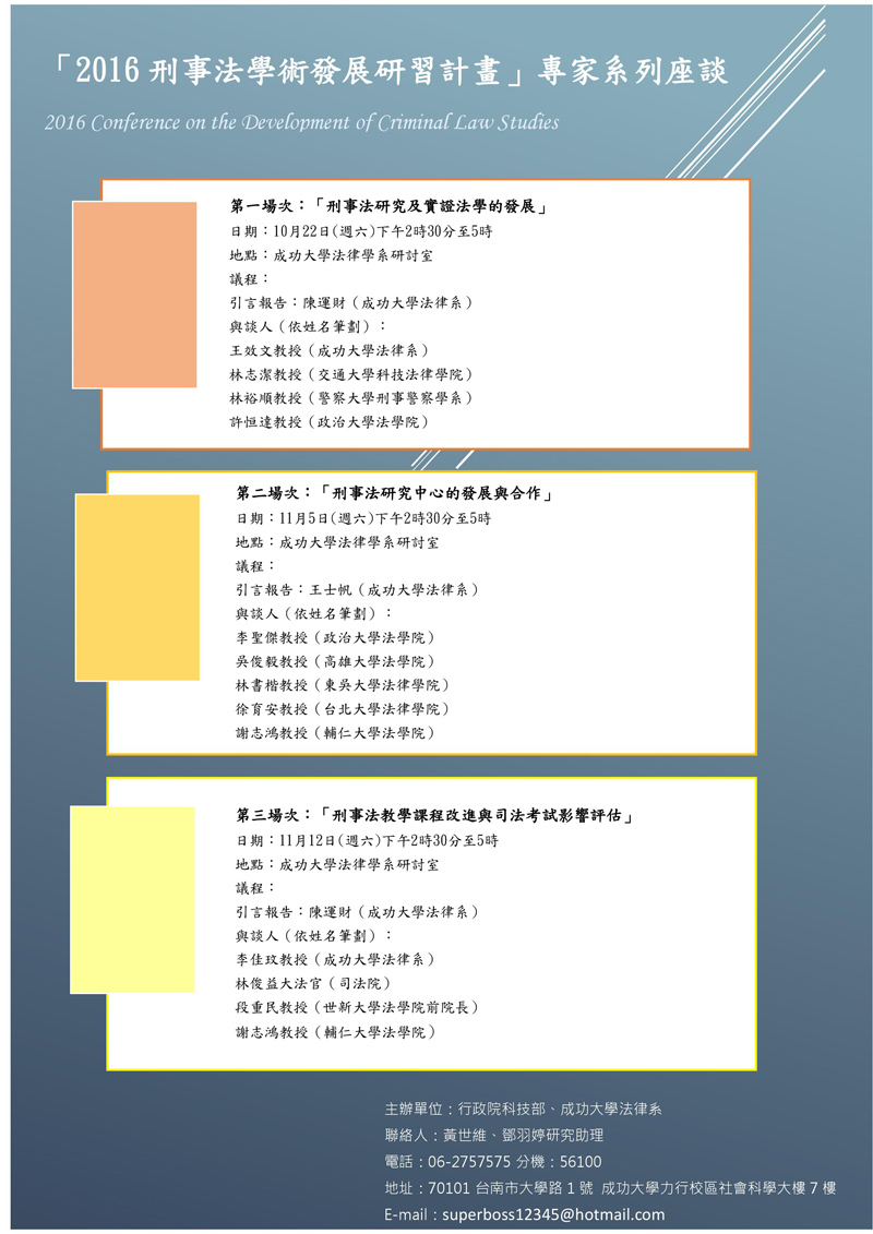 過去長期以來各校系刑事法學者之間,除了透過刑事法相關的學會及各系所自行舉辦的研討會針對特定議題進行學術交流外,就一般性之刑事法的課程設計、教學方式及研究動向等,因礙於工作條件不一、區域位置分布等因素,可謂少有彼此交換心得及進行討論的交流平台及機會。惟近幾年來由於引進大學系所評鑑制度、新制律師及司法官考試的實施以及法律學門學術評鑑或獎勵以SSCI 及TSSCI 等作為依據的影響等外在環境及制度的變革下,刑事法學整體的教學及研究面臨了新的挑戰。有鑑於此,為刑事法學者們搭建可開誠布公的交流平台,面對面溝通、提出並思考共同面臨之教學及研究發展上的問題,以交流、互補、整合來逐步提升我國刑事法法學教學及研究發展的能量,乃具有高度重要性。成功大學法律系於行政院科技部的規劃補助下,分別針對「刑事法研究與實證法學的發展」、「刑事法研究中心的發展與合作」和「刑事法教學課程改進與司法考試影響評估」三大議題,邀請學者專家舉辦系列座談,期待能展開充分的經驗交流和對話,一方面提供考選機關作為改進國家考試刑事法測驗範圍及出題方式等之參考,同時作為國內刑事法教學及研究進行後續交流的基礎。