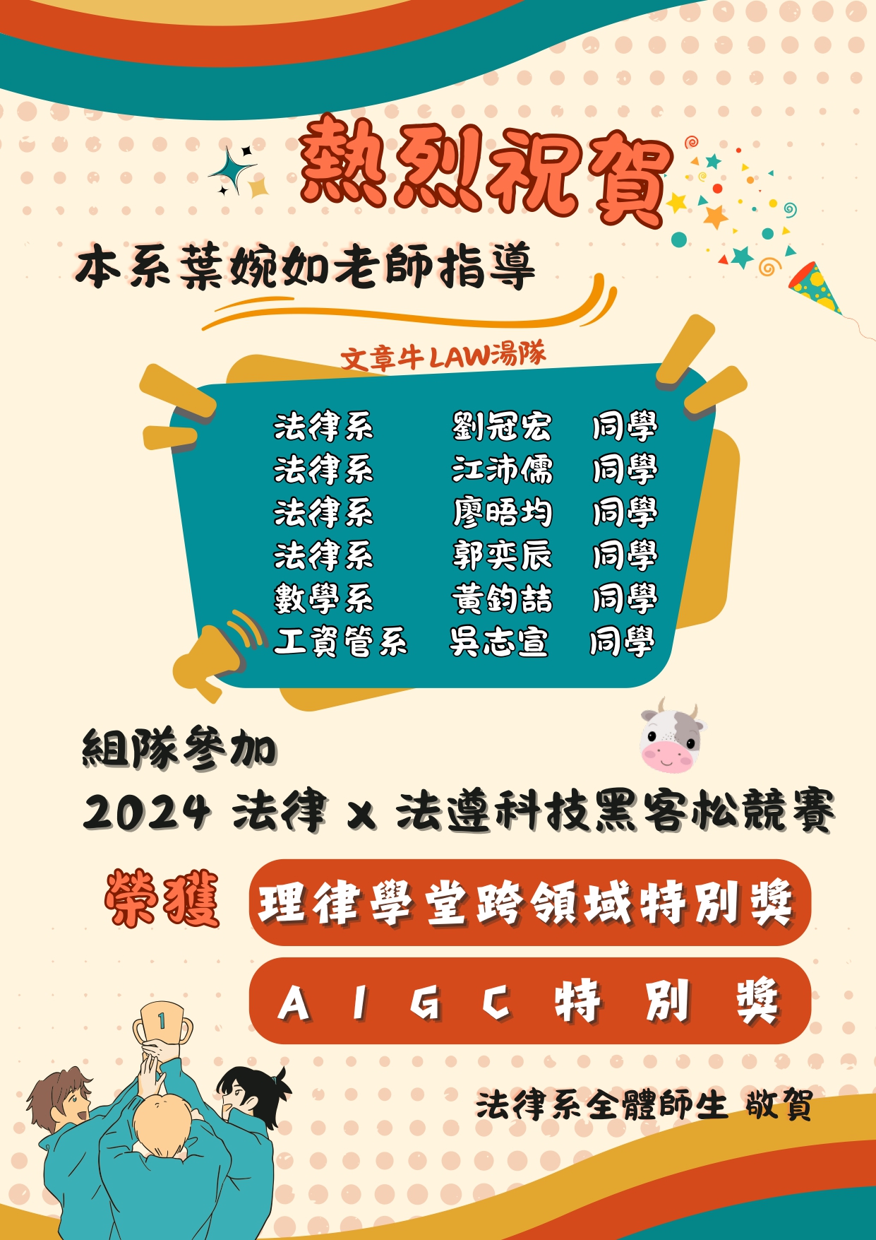 熱烈祝賀本系葉婉如老師指導本系劉冠宏、江沛儒、廖晤均、郭奕辰等學生參加2024法律x法遵科技黑客松競賽,榮獲理律學堂跨領域特別獎、AIGC特別獎