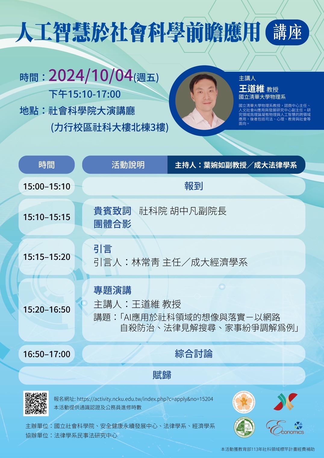 15:20–16:50 | 專題演講 | 主講人:王道維 教授 講題: :「AI應用於社科領域的想像與落實–以網路自殺防治、 |