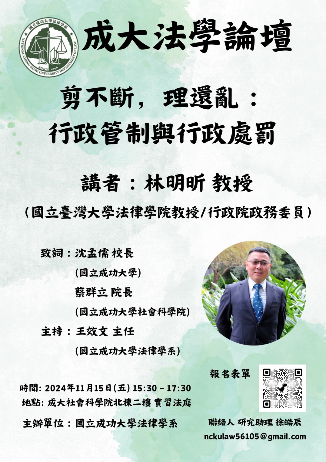 成大法學論壇辦理專題講座,本系有幸邀請到現任行政院政務委員的林明昕教授,為我們分享行政管制和行政處罰等行政法上重要議題,機會難得,歡迎報名。