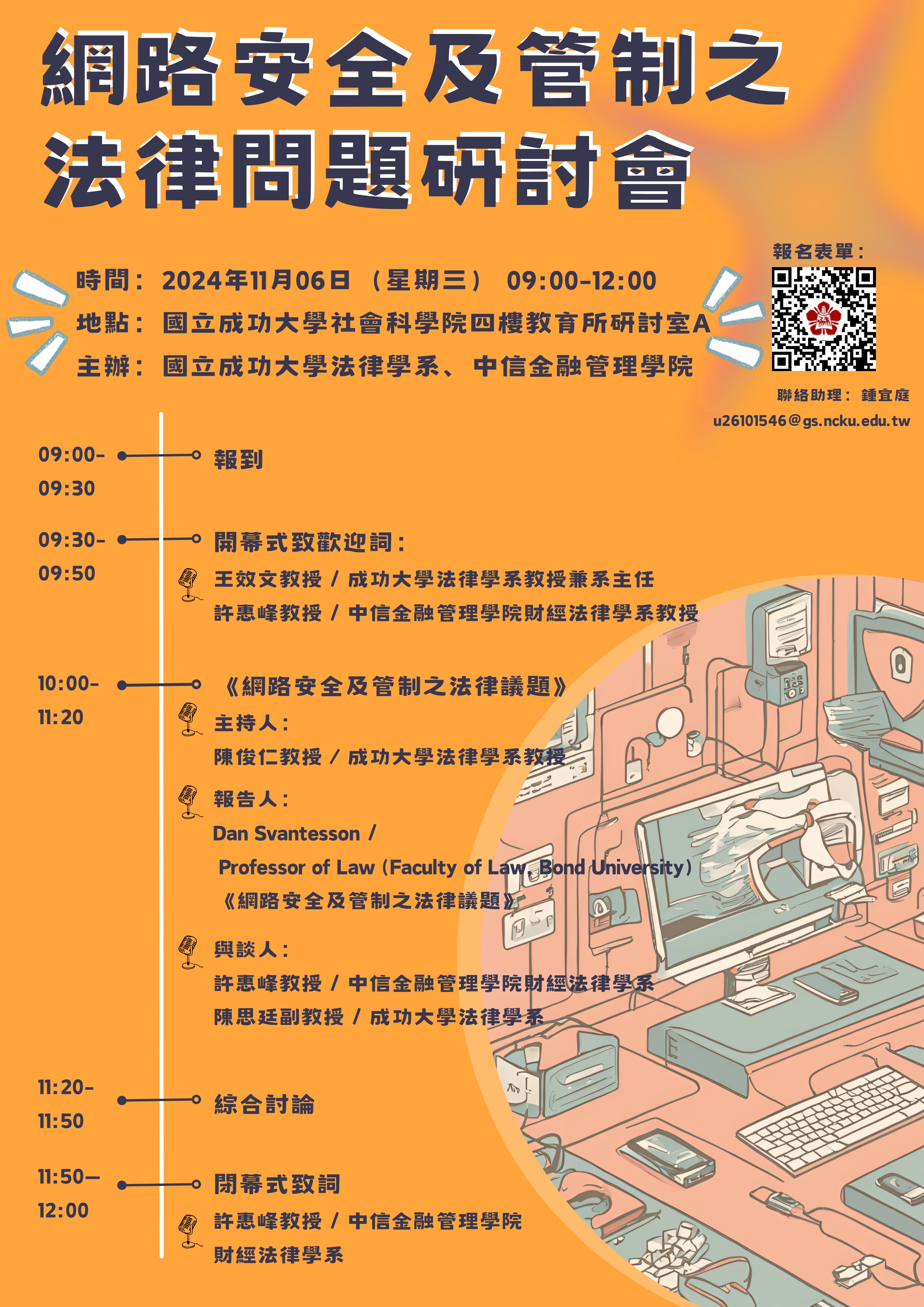 國立成功大學法律學系與中信金融管理學院將共同舉辦「網路安全及管制之法律問題」研討會。這是一場能夠深入探討當前數位時代中重要法律議題的良機,千萬不可錯過!