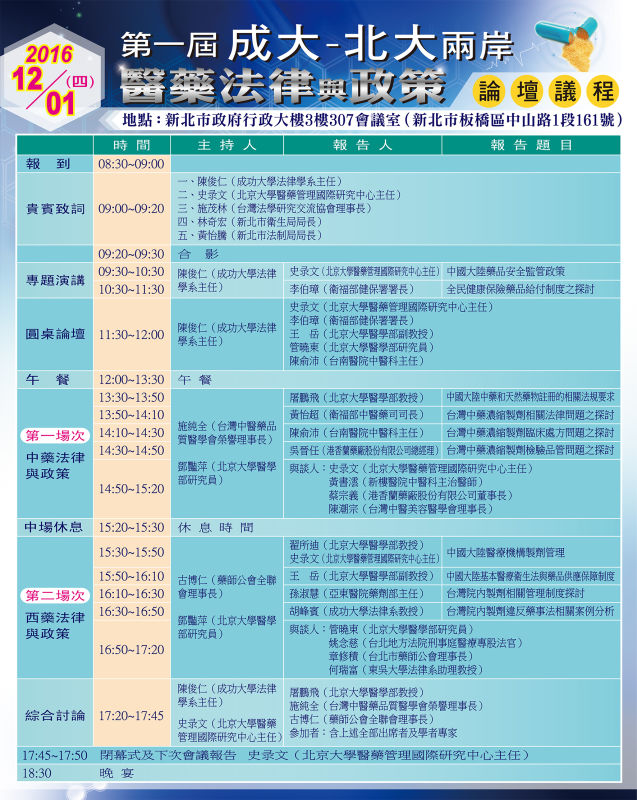 [105.11.29] 12月1日 第一屆成大北大醫藥法律政策論壇