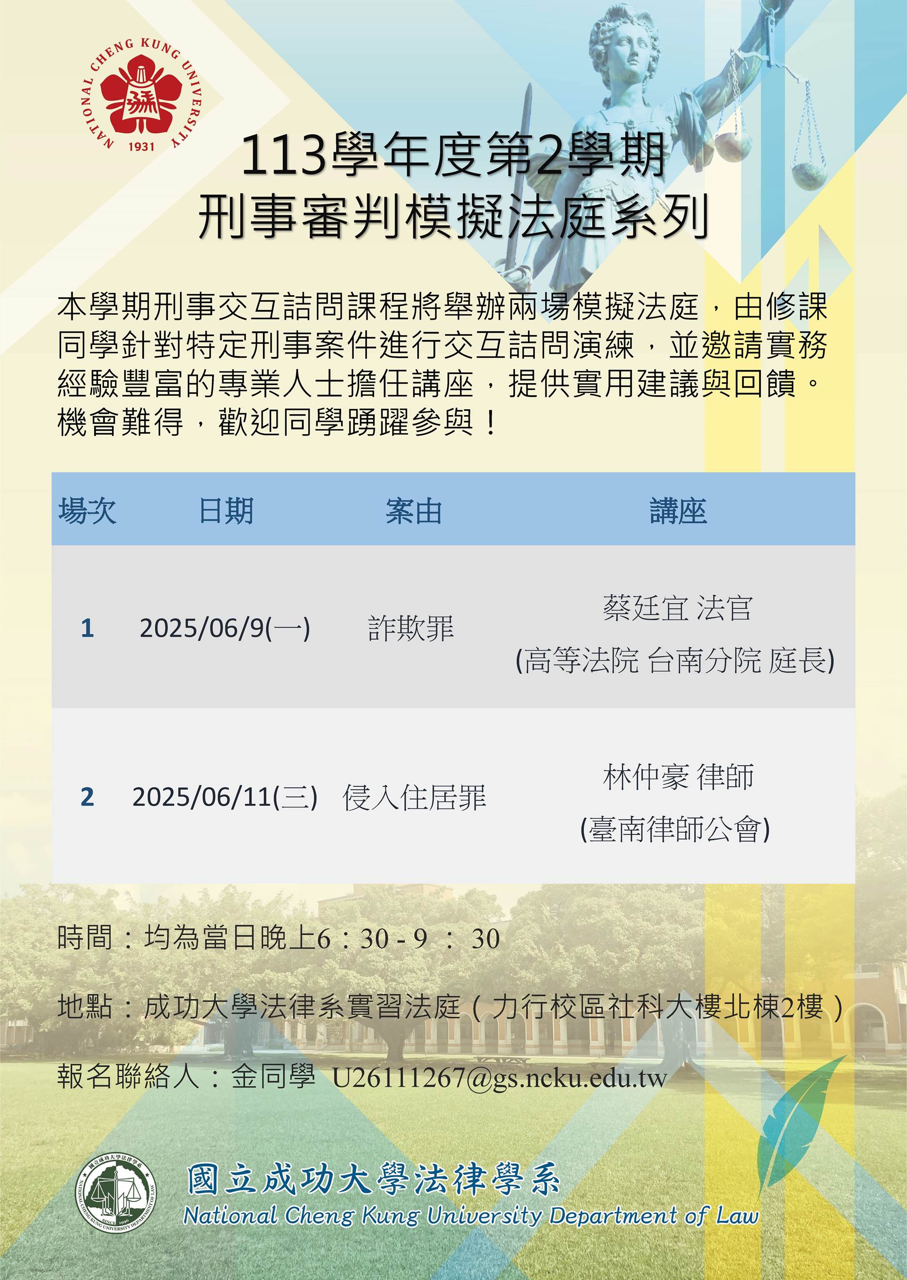 成功大學法律系113學年度第二學期刑事交互詰問模擬法庭場次表