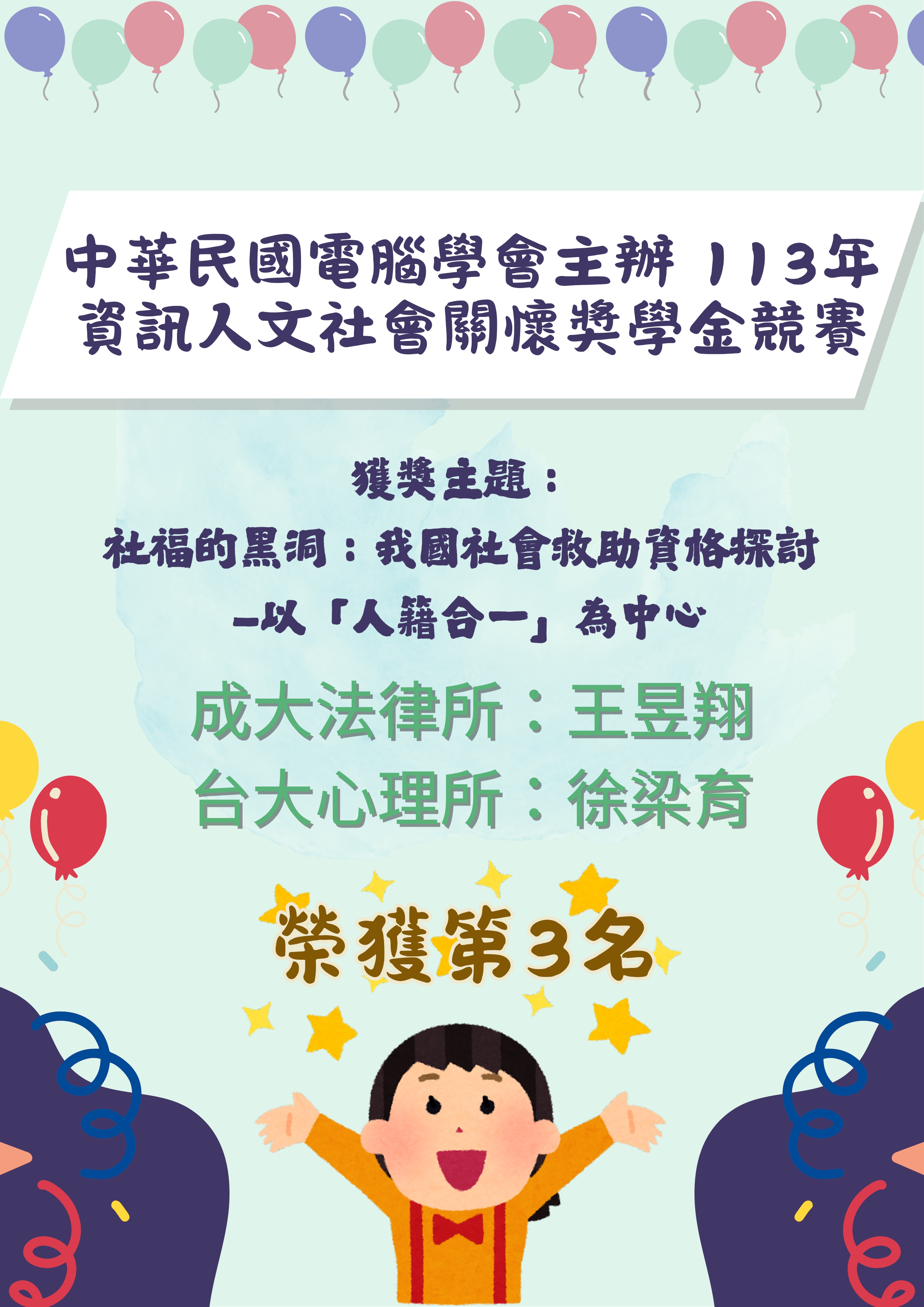 恭賀本系王昱翔同學榮獲中華民國電腦學會主辦113年資訊人文社會關懷獎學金競賽第三名