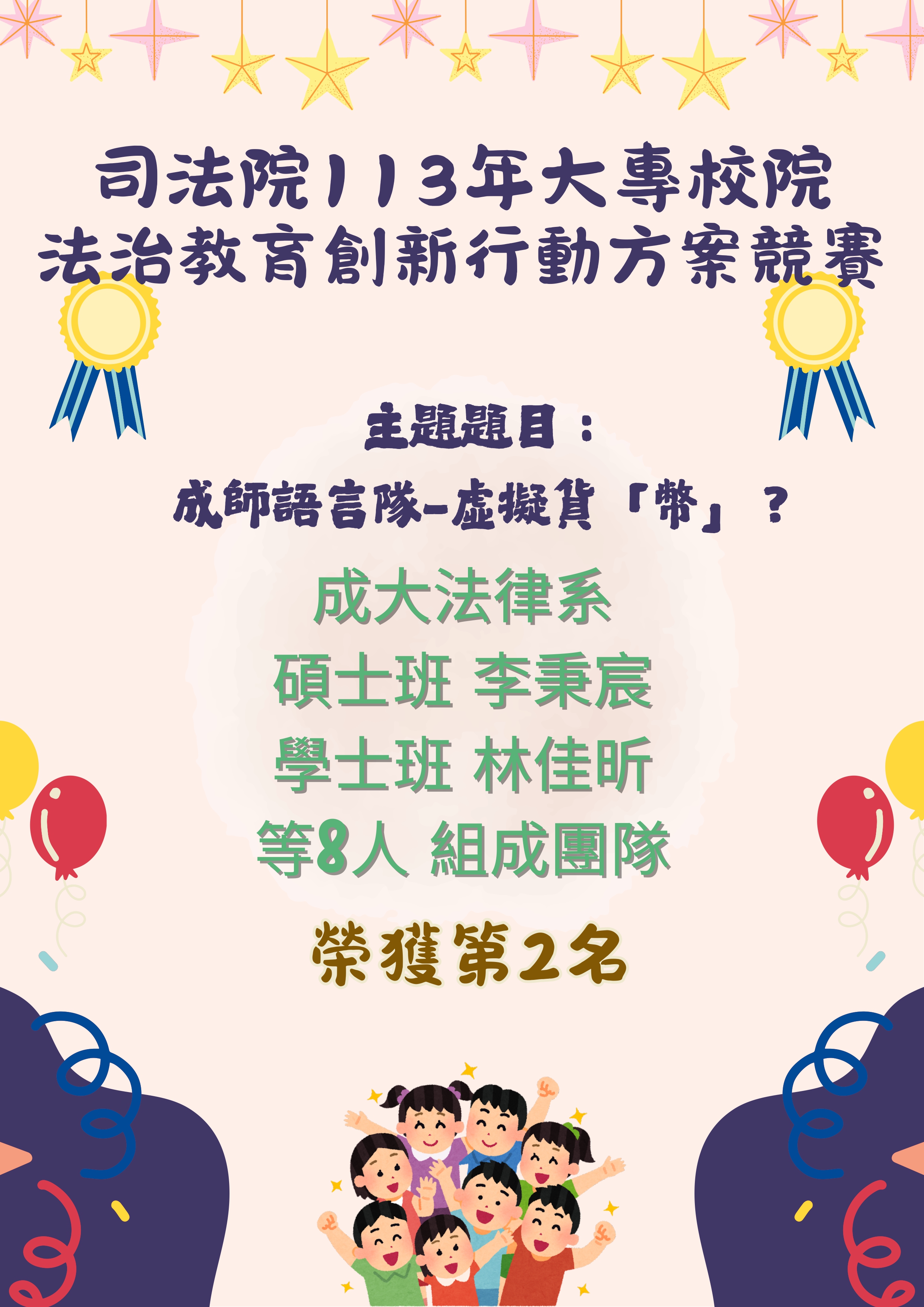 恭賀本系李秉宸、林佳昕同學榮獲司法院113年大專校院法治教育創新行動方案競賽第二名