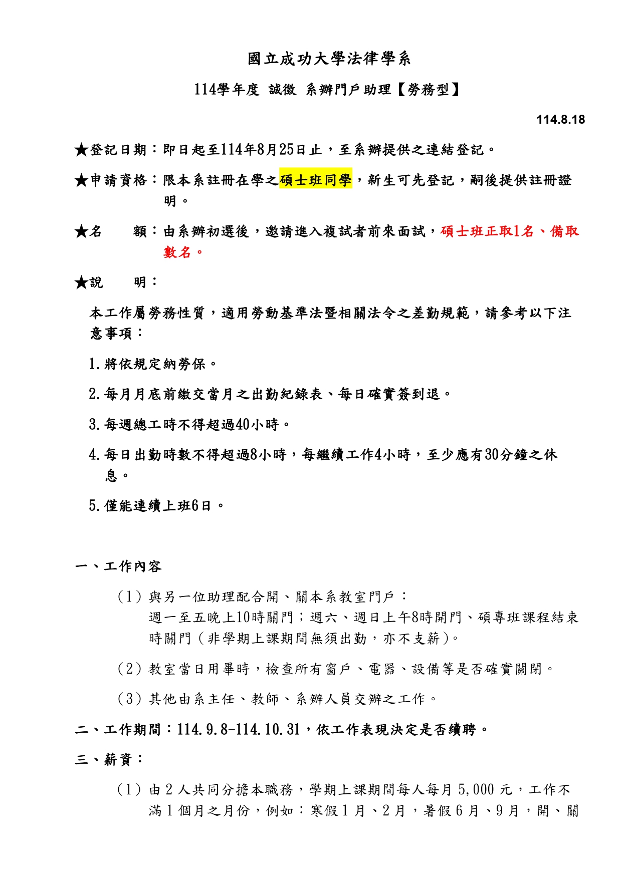 【公告】成大法律系誠徵114學年度系辦門戶助理(勞務型)碩士班1名,詳附件公告。