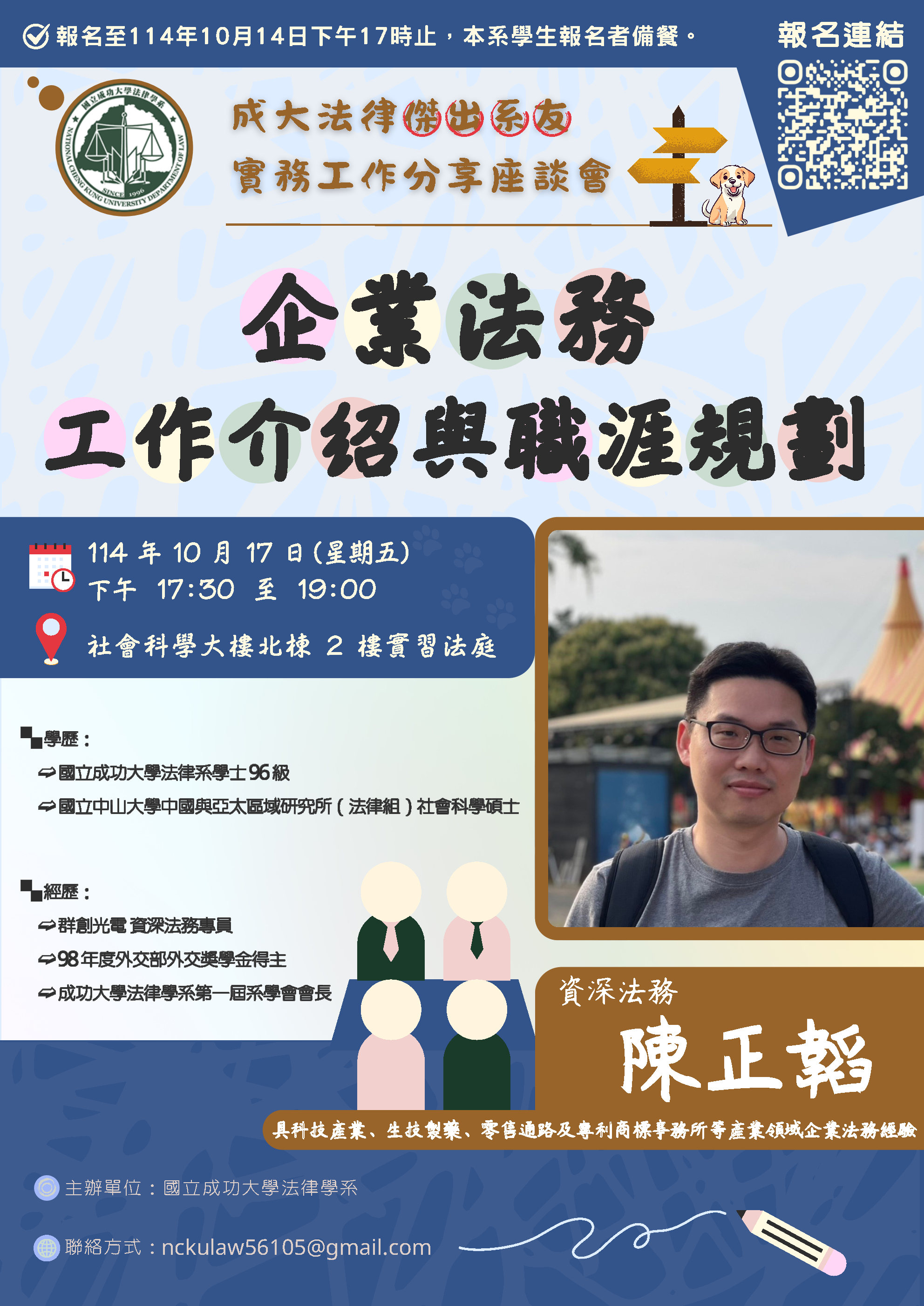 歡迎參加本系114年10月17日「傑出系友實務工作分享座談會」(陳正韜學長 - 企業資深法務)