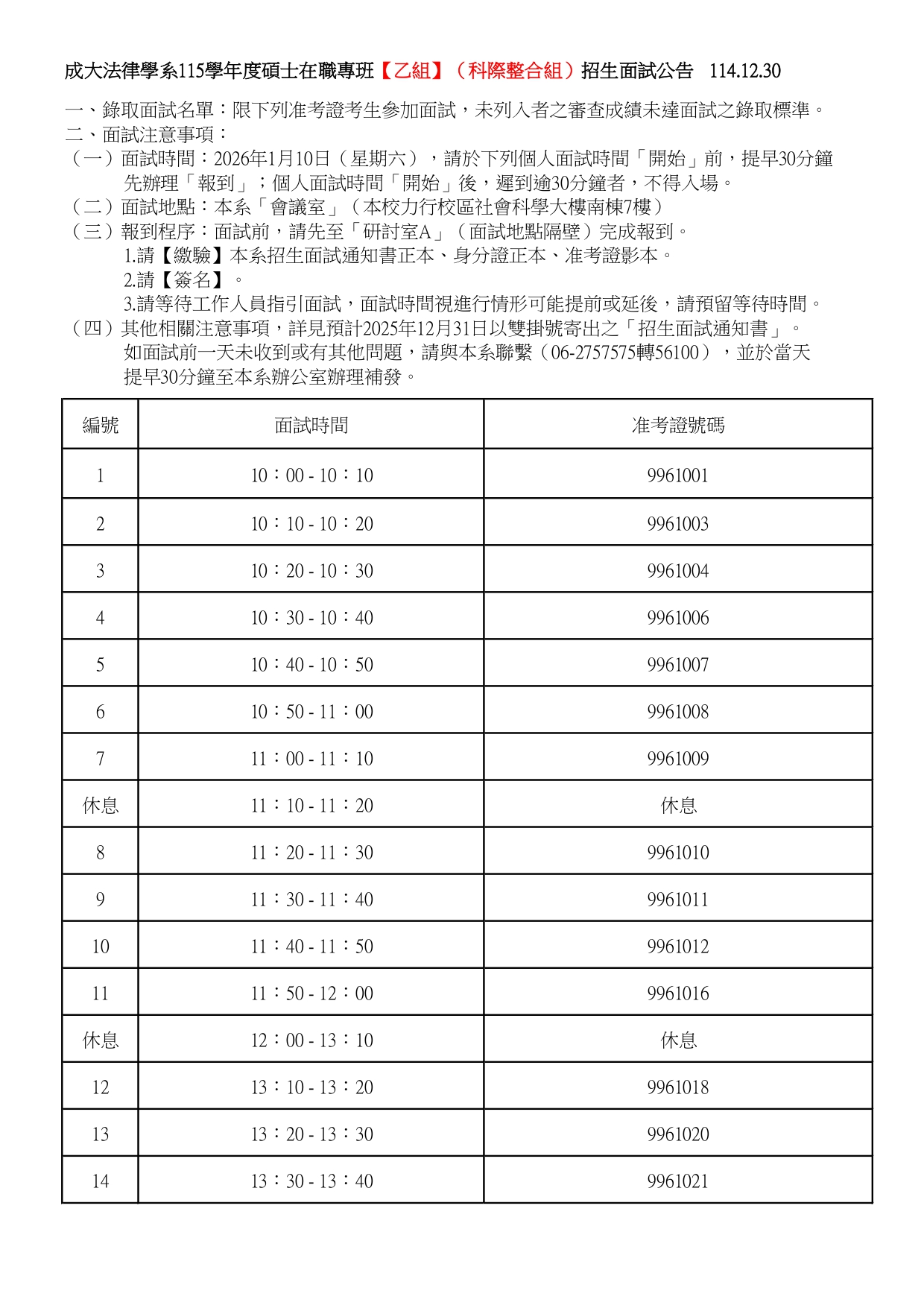 本系115學年度碩士在職專班【乙組】(科際整合組)招生面試公告