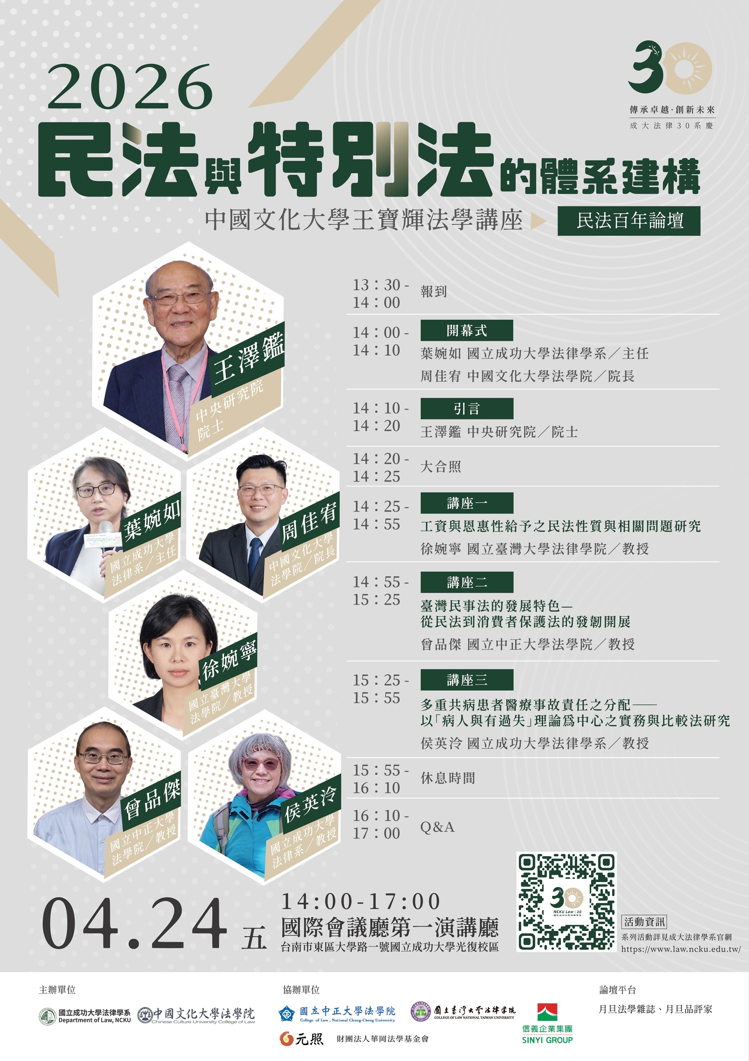 「成法30」法律系系慶30週年特舉辦「民法百年論壇——2026民法與特別法的體系建構」學術講座,由王澤鑑院士引言,邀請多位學者專家共同與談,從理論與實務面向探討民法與特別法之體系發展與重要議題,內容精彩可期,誠摯邀請本校師生踴躍參與。